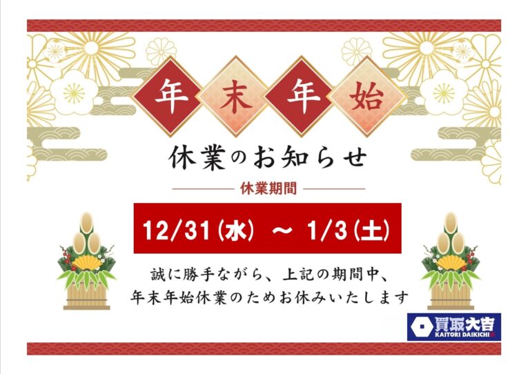【年末年始休業のお知らせ】12/31〜1/3はお休みです📢|伊賀市で買取なら大吉…